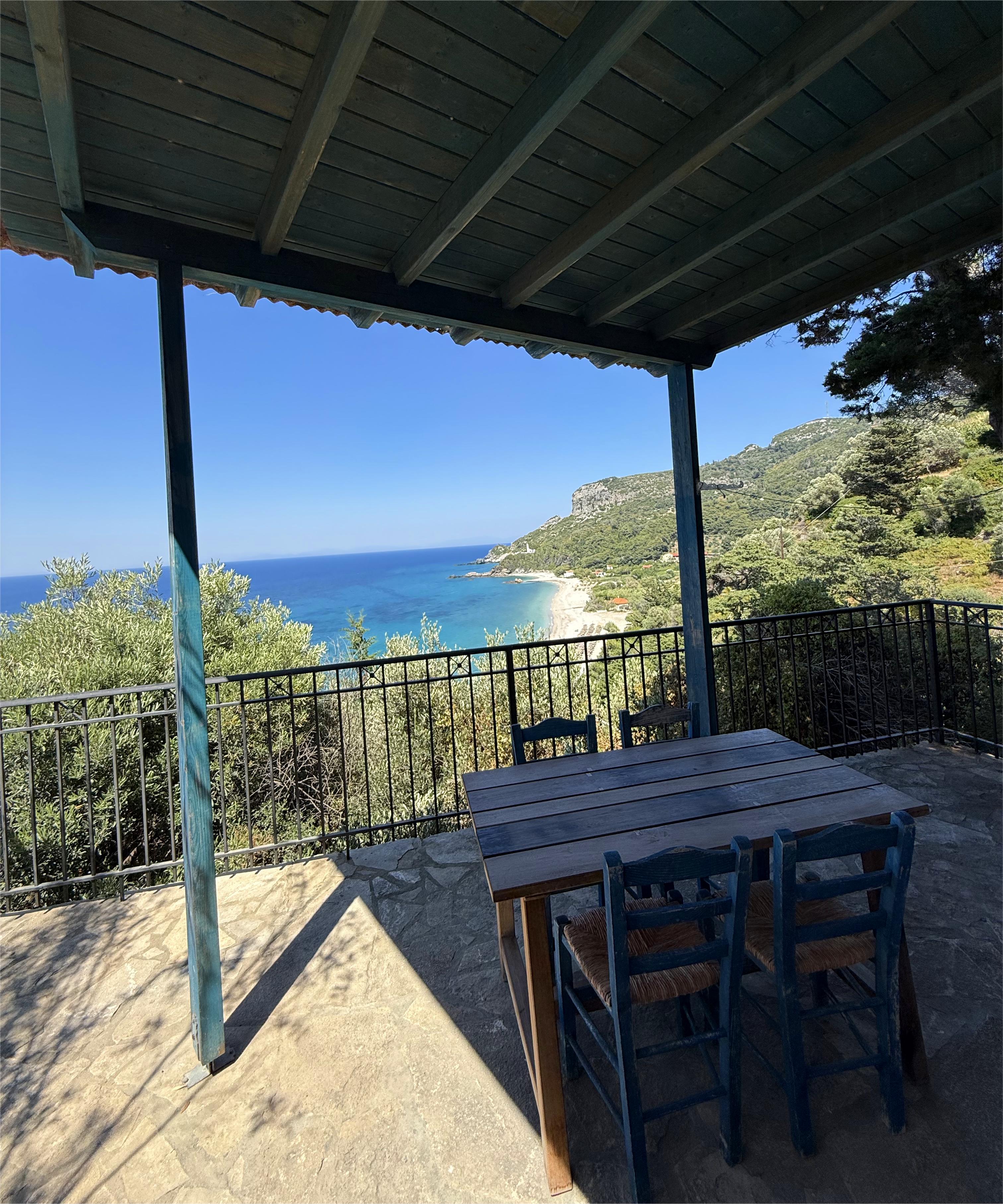 Ungefähr drei Kilometer vom Hafen Karlovasi entfernt, auf einem Felsplateau mit einem überragenden Blick auf das Meer und die Potami-Bucht.