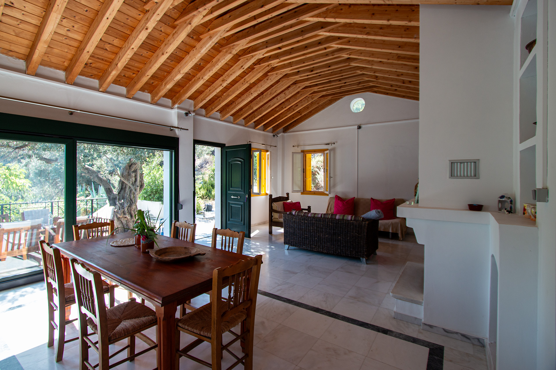 Drei neue Appartements und ein neues Ferienhaus. Die Appartementanlage ist in griechischer Stilrichtung erbaut, dem Landschaftsbild sensibel eingefügt und mit viel Liebe und Geschmack gestaltet. Jedes der Häuser hat eine Terrasse und ist von einem Blumengarten umgeben.